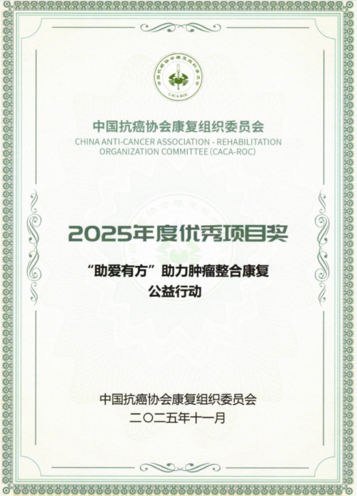 “助爱有方”项目凭借其创新性和实效性,荣获2025年度全国癌症康复组织优秀项目奖。浙江省抗癌协会癌症康复专业委员会副主任委员郑燕、杭州市癌症康复协会常务副会长肖骏、胡庆余堂集团方格堂体质健康管理学院执行院长涂光明、麦特快乐家园于玉文作为四方共建单位代表登台领奖。
